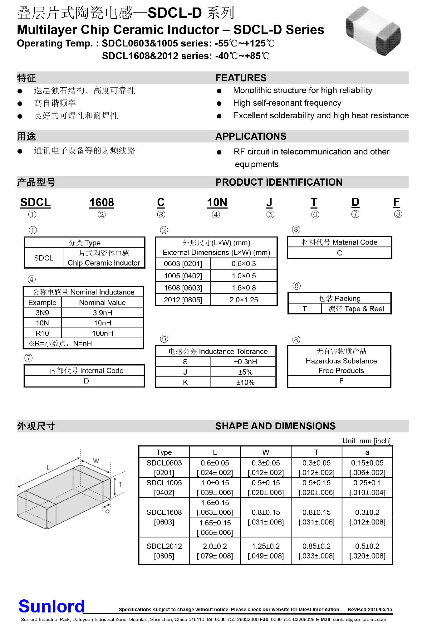 順絡疊層貼片電感0603 SDCL0603Q10NJT02B0片式多層電感器